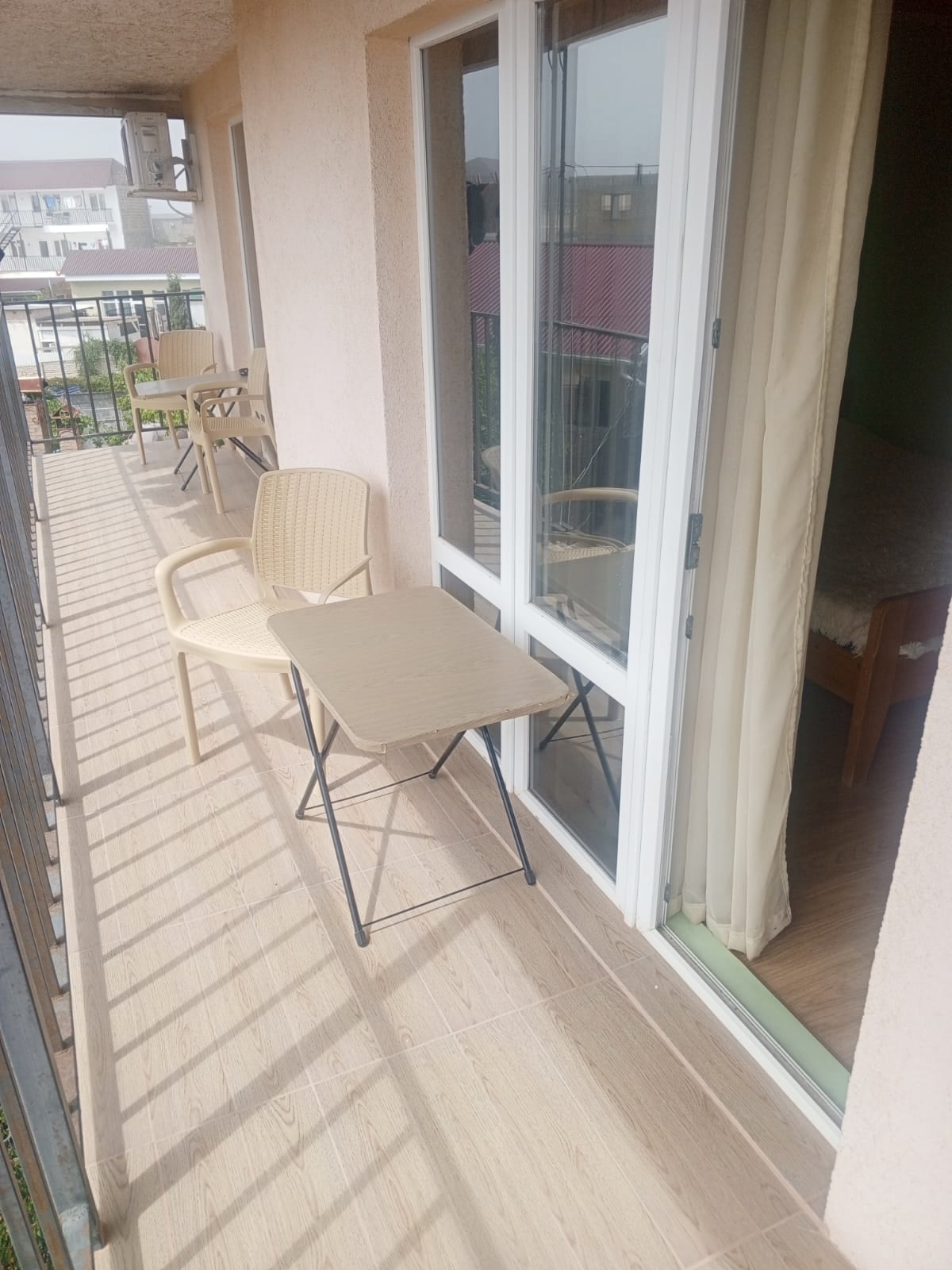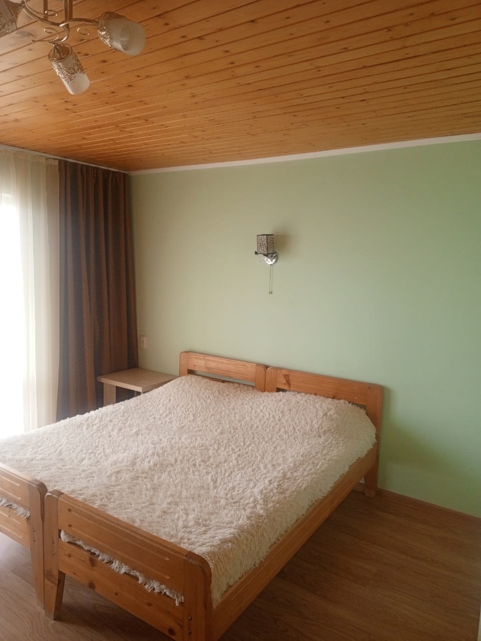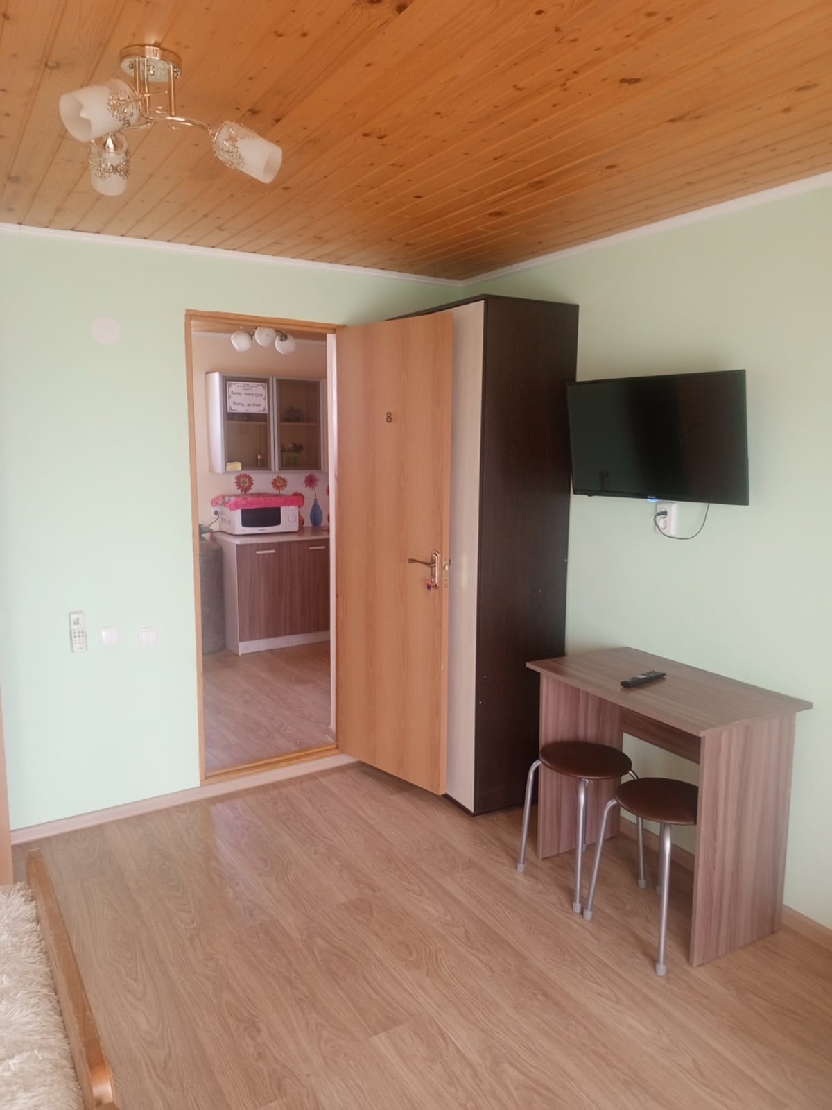 В номере: душ и сан.узел в номере, шкаф, столик, двуспальная кровать + доп.место односпальный диванчик в номерах 2+1, в номерах на 3-4 человека – двуспальная кровать + диван/кровать раскладной полуторный. Кондиционер. Телевизор. Кухня одна на этаж, газовая плита, набор посуды, микроволновка, холодильник . Гладильная доска, утюг. На этаж идут три номера